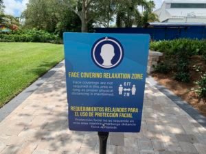 Face coverings are required at SeaWorld Orlando. They are supposed to cover the mouth and the nose. There were way too many people who were not following this rule. Some people pulled them down to uncover the nose, while others pulled them all the way off of their faces. We even saw people who were carrying them, and they were not eating or drinking. Face coverings are going to be a part of visiting theme parks for the foreseeable future. If you can’t follow the rules, please stay home. There are Face Covering Relaxation Zones. These are places where you can sit down and take off the mask for a few minutes, as long as you stay away from the other groups in the zone.