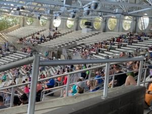 There were a lot of empty seats at the show, but that was on purpose. Entire sections were blocked off. In those that were open, there were rows that were closed. The open rows had markers to let people know where to sit. When the show was over, the guests were instructed to stay in their seats. We were then led out by colored flags. When the flag for our section was called, we left row by row. It was a way to empty the stadium without a crowd gathering.