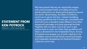 We have proven that we can responsibly reopen, with science-based health and safety protocols strictly enforced at our theme park properties around the world. Nevertheless, the State of California continues to ignore this fact, instead mandating arbitrary guidelines that it knows are unworkable and that hold us to a standard vastly different from other reopened businesses and state-operated facilities. Together with our labor unions we want to get people back to work, but these State guidelines will keep us shuttered for the foreseeable future, forcing thousands more people out of work, leading to the inevitable closure of small family-owned businesses, and irreparably devastating the Anaheim/Southern California community.