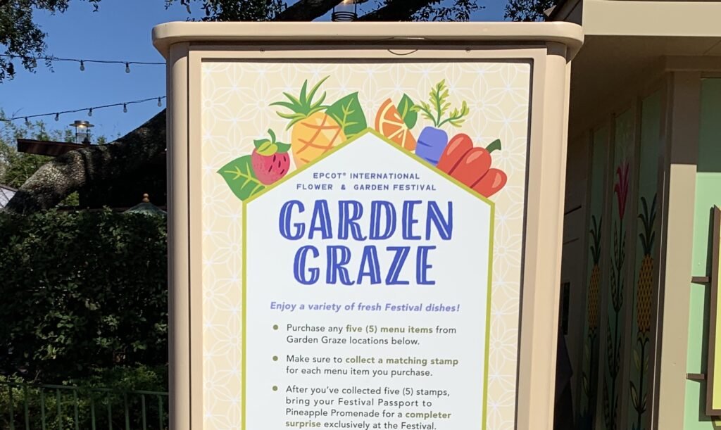 Garden Graze is the food stroll at the Epcot International Flower & Garden Festival. You will purchase five items and have your passport stamped, and then receive a sixth item for free. The five Garden Graze items are all plant-based. The reward is mango-lime flavored Dole Whip in a souvenir cup, and this is where the warning comes in. It is topped with a decorative 50th Anniversary chocolate decoration that contains dairy. You can easily ask for your treat without it. As the mother of someone with a dairy allergy, I hope that this changes soon. My daughter’s allergy is mild, but this could cause a serious problem for someone with a severe allergy.