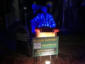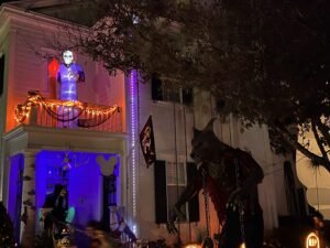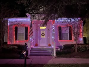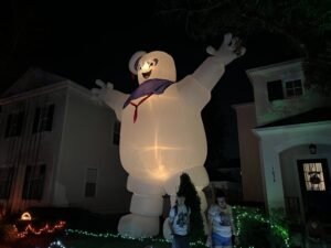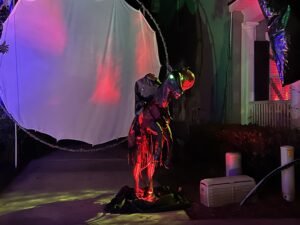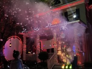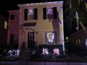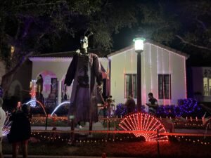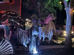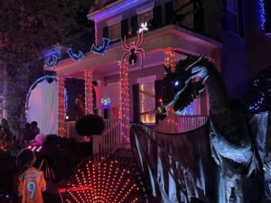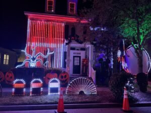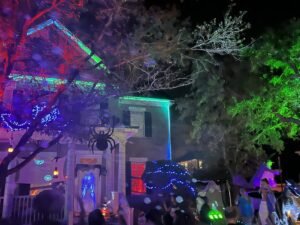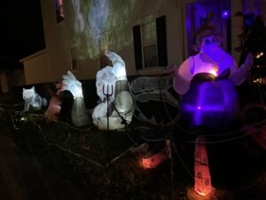 I’ve mentioned The Lights on Jeater Bend before at Christmastime. It’s an annual display in Celebration, Florida, put on by a group of families who live on Jeater Bend. They also have a Halloween display, which runs from 7:00 until 9:30 each evening through Halloween. If you’re in town, check it out! It’s free, although donations are accepted for a local charity. Type Jeater Bend into your GPS, and then park on Celebration Avenue. This is most likely the final year for The Lights on Jeater Bend, you don’t want to miss the Halloween or Christmas displays! Here are a few pictures from this year’s display.