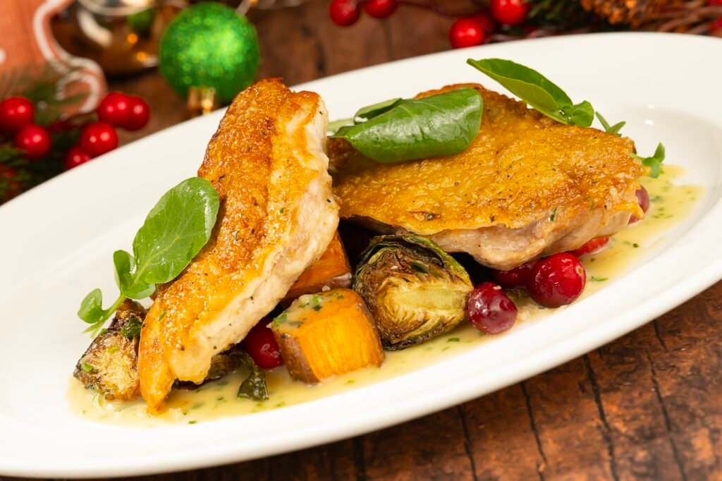 - Poulet Rouge Chicken: Roasted sweet potatoes and brussels sprouts with a cranberry pan sauce (Available during Mickey’s Very Merry Christmas Party only) (New)