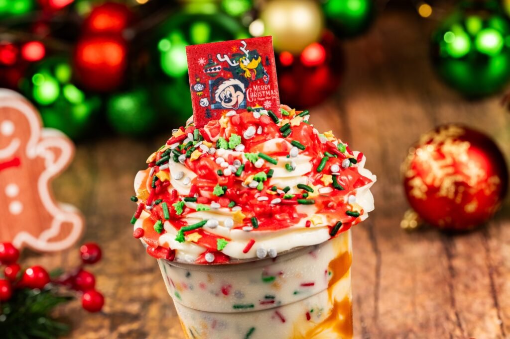 - Milk and Cookies Shake: Vanilla shake with caramel, holiday cookies, and chocolate chip cookie dough topped with whipped cream and festive sprinkles (Non-alcoholic) (Available during Mickey’s Very Merry Christmas Party only) (New)