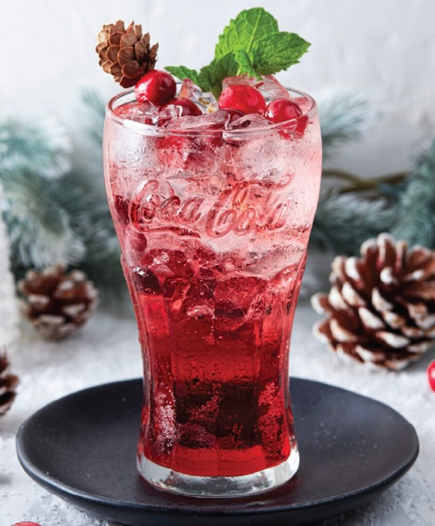 - Coke Cinnamon: Coca-Cola with cinnamon syrup, whipped cream, and graham cracker crumble in a Santa cup (Non-alcoholic)