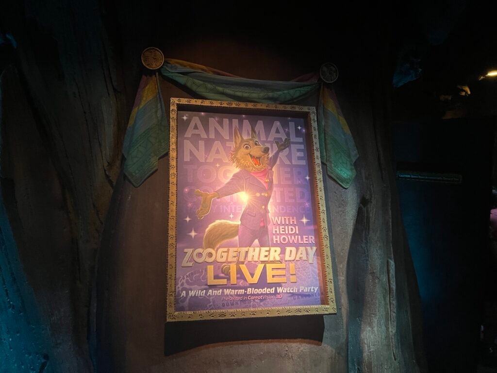 I didn’t see any changes in the outdoor queue. Once inside, it was a different story. It was all about Zootopia and the first “Zoogether Day”. I would have loved to have been able to spend some time in the preshow area, it was filled with posters and information. But we were packed in and there wasn’t a lot of time.