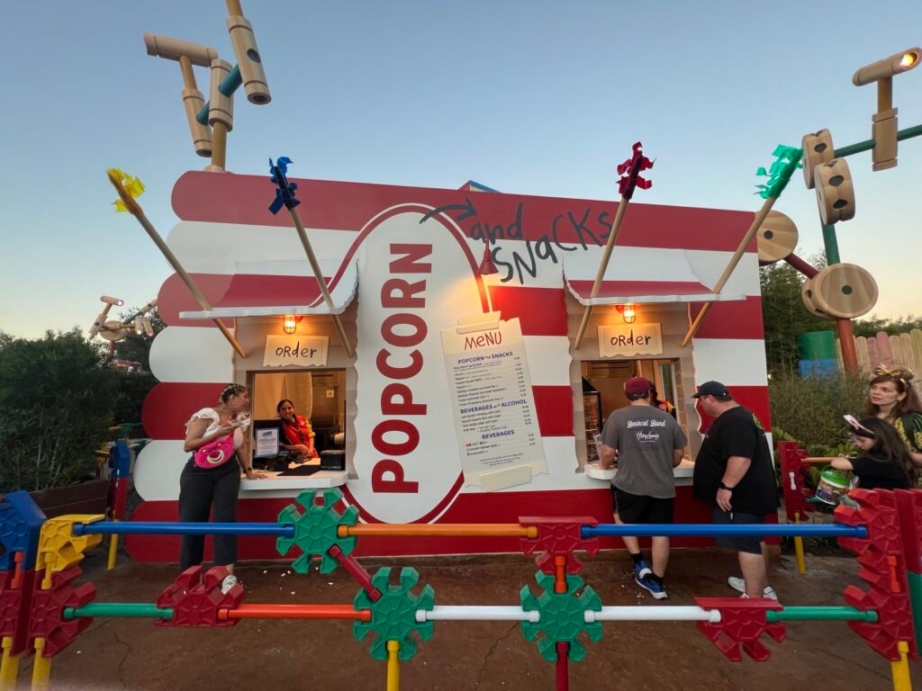 Andy is at it again! He’s set up a popcorn and snack kiosk in his backyard using an old popcorn box. Called Popcorn and Snacks, the menu features popcorn, of course, as well as Pizza Planet Spring Rolls, churros, ice cream novelties, and drinks. (I’m not sure why a kid like Andy is serving drinks with Jack Daniel’s, but that’s beside the point.) Popcorn and Snacks is at the far end of Toy Story Land, near the entrance to Star Wars: Galaxy’s Edge.
